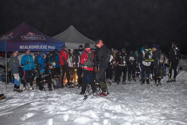 Probíráme výbavu, děláme hromádky a na chvilku usínáme. Před 23. hodinou se Zdenda začíná strojit a dobalovat. "Co blbneš, vždyť půjdeme až za půl hodiny?", namítám. Nicméně se nechám strhnout a lehce před půl dvanáctou sedáme do auta a jedeme asi kilák a půl ke startu. Cestou narážíme na policejní auto se zapnutým majáčkem, blokující cestu. Nemůže nás pustit, protože se tudy za chvilku běží závod. MY BĚŽÍME TEN ZÁVOD!!! Prorážíme zábrany a jedeme ke startu. Proti nám už pádí první světlušky a za nimi nekonečný dav asi šestiset lidí na dlouhou trať. Rychle parkujeme, házíme na sebe batůžky a běžíme ke startu proběhnout koberec na čipy. Nádáváme, jaký jsme pitomci, že si nejsme schopni ani přečíst, že start je už v půl dvanáctý. Očividně ale nejsme sami. Vyrážíme na trať a ještě na hlavní silnici dobíháme chvost balíku. Trasa odbočuje na menší cestu, řítíme se přes závodníky a předbíháme po stovkách. Přes nás se přežene Vabroušek s Cyprou, pozdější vítězové. Taky neumějí číst propozice.