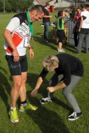Vítám se s Jirkou a Ivetou, sedám si na zem a jsem na měkko. V duchu děkuju novohradskýmu Krakonošovi, že mi to dal. Posílám zprávu třem nejbližším, na kterou jsem se těšil posledních dvacet kilometrů: STOVKU UBĚHNE KAŽDEJ DEBIL :)). Tohle jsem si prostě musel vychutnat. Dostávám spoustu gratulací na mobil. Píše mi Lucy, že ji to až rozbrečelo. Brečím taky. A nepřestávám se usmívat. Jako debil.